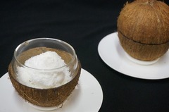 ココナッツピューレと牛乳で炊いたお米とココナッツのクリーム、フレッシュのココナッツを削り、牛乳のムース、グラニテを添えられました。
