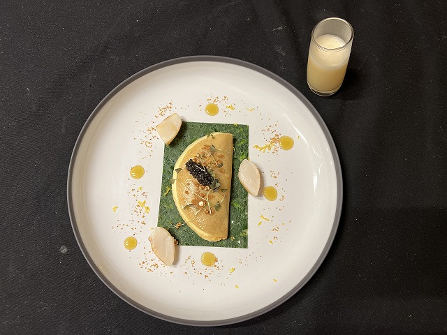 次にソースです。シンプルなオランデーズソースの仕上げに黄色ワイン(シャトー・シャロン)を加えることで、ソースにはメリハリが生まれ、さらに香りも華やかに仕上げていました。
