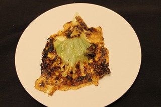 さっと塩茹でしたキャベツを鉄板に乗せ、凝縮した魚の出し汁にコーンスターチを加えたものを流しいれ、周囲を香ばしく焼きます。
