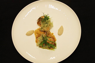 燻製にしたスカンポのピュレを底に敷きこみ、塩で漬け込んだレモン、塩茹でにし薄皮を剥いたグリンピースを乗せ、お店の庭園で採れた香草をヘーゼルナッツ油で調味し、華やかに盛り付けられています。