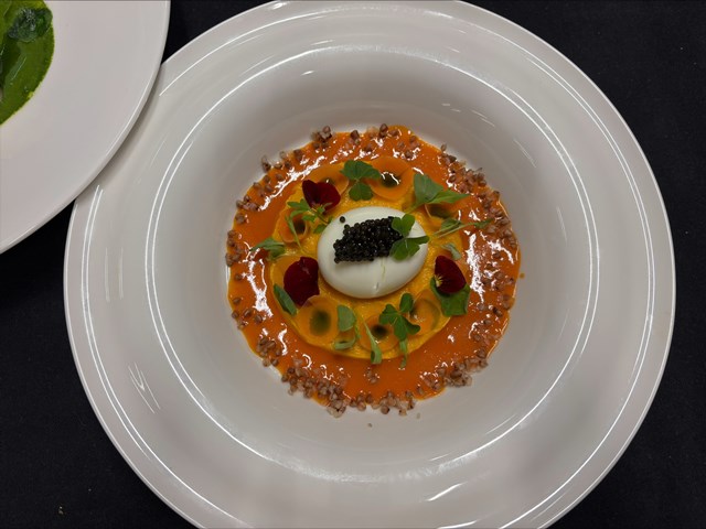 Purée de carottes, Jus de carotte réduit citronnelle et gingembre pickles de carottes au vinaigre de citron et Œuf mollet au caviar