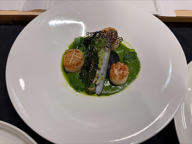 Noix Saint-Jacques rôties au beurre noisette, raviole de couteau et tuile à l'encre de seiche, Emulsion de cresson iodé