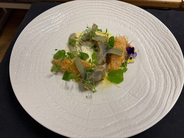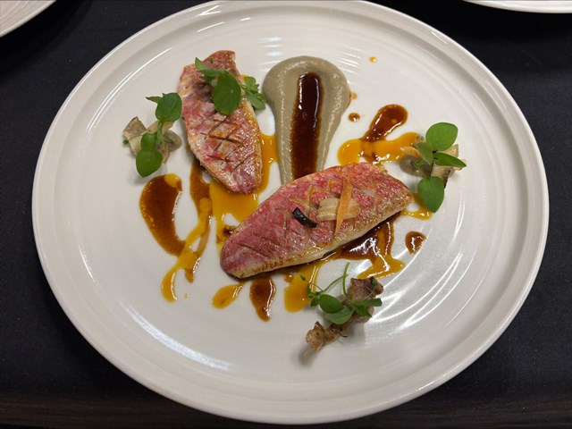 Rouget Barbet cuit sur la prau, purée d'artichaut au foie gras, jus de veau et huile d'orange, chips de légumes racines