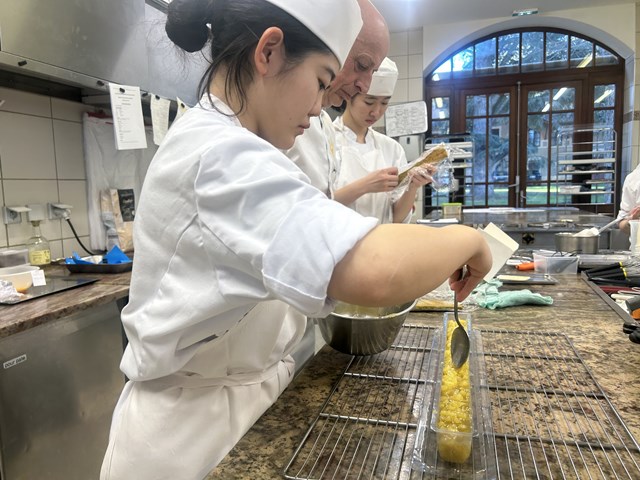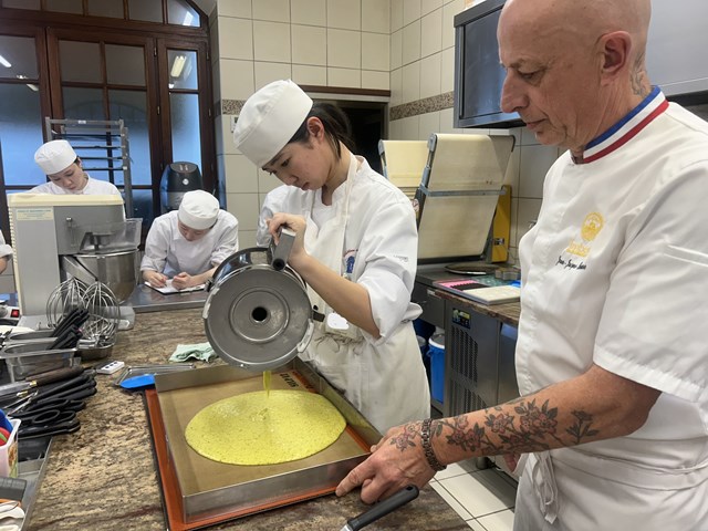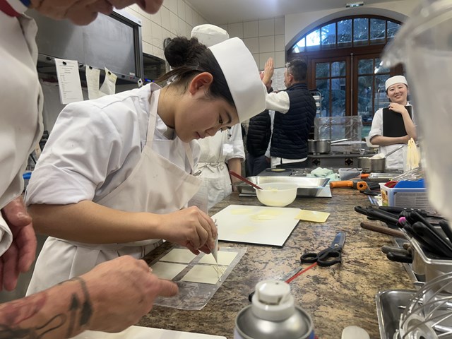 『初めてのアシスタントでとても緊張していましたが、シェフにひとつひとつ教えていただきながら多くの作業を任せてもらえました。作業前にお手本を見せてくださっただけでなく自分のやっている作業自体も見てくださっていたため安心して作業に取り組めました。しかし、初期の頃よりも翻訳を交えず理解できることが多くなったものの、まだまだ100%を理解できているわけではないのでこれから残りのデモンストレーション、実習に向けて、またスタージュに向けてより多くのフランス語を理解できるようになりたいと思いました。』