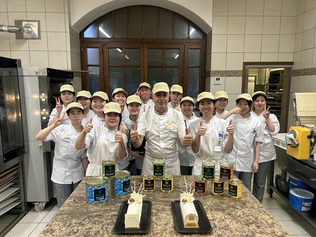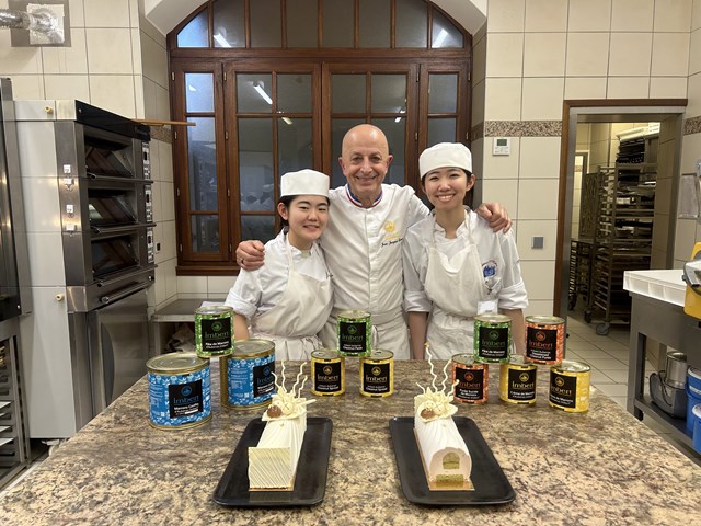 マロン・アンベールは、栗を扱うトップブランドの会社で、水あめを使用しないことであっさりした甘さで食べやすい製品を提供されています。ボルヌ氏は日本にもデモンストレーションで30~40回ほど行かれたことがあるそうです!毎期フランス校の講習に来てくださり、アンベール社の製品を使ってお菓子を作ってくださっています。