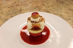 お菓子の構成は下から、いちごのソルベ。まわりをチョコレートで薄くコーティングし、その中にいちごのコンフィ。二段目はカスタードクリームとメレンゲを合わせたシブーストクリーム。下が透けて見えるまで薄く伸ばしたパイ生地を焼いてシブーストを挟んでいます。三段目は小さいシュー生地に中にはいちごのクリーム。横にはバニラの生クリーム。上には薄く焼いたアメに、また小さいシューで飾られています。周りには冷凍いちごから作ったジュースをたっぷり使っています。