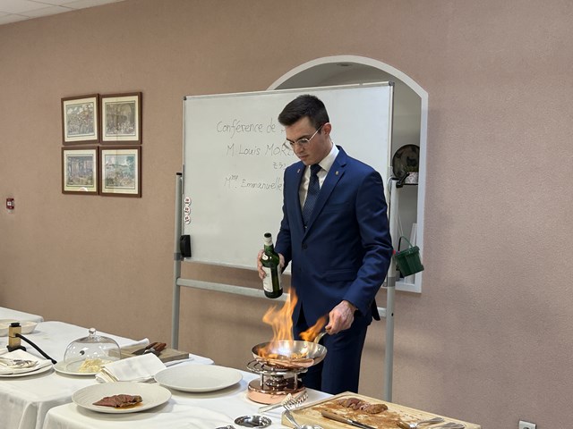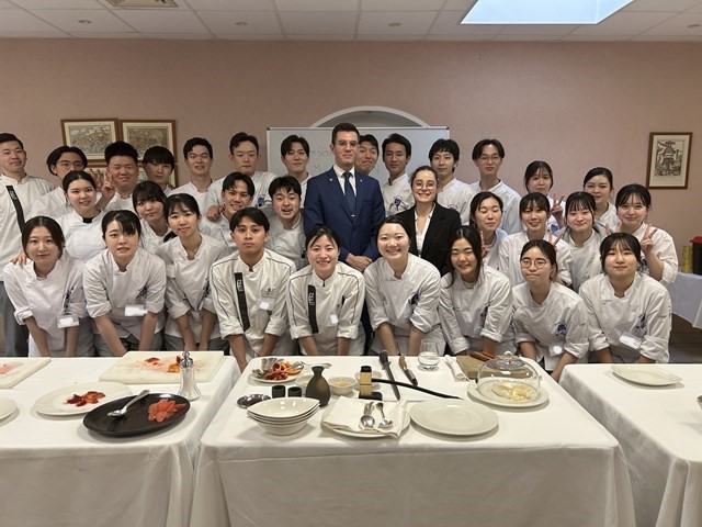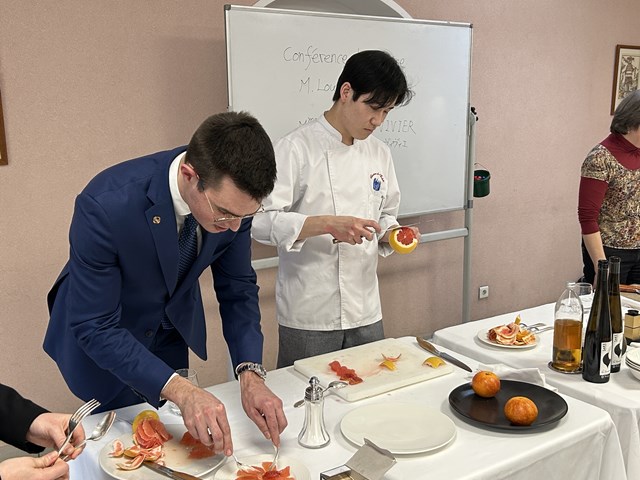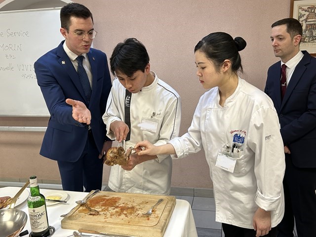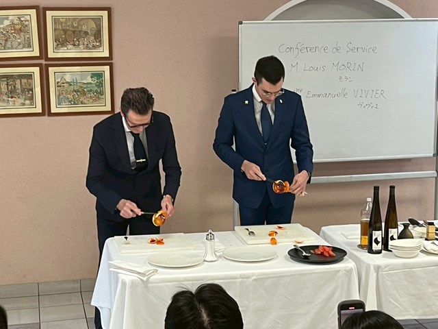 今回の外来講師は、Restaurant Paul BOCUSEのMaître d'hôtelメートル・ドテル (給仕長) である、M.Louis MORIN(ルイ・モラン)氏と、Mme Emmanuelle VIVIER(エマニュエル・ヴィヴィエ氏)にお越しいただきました。