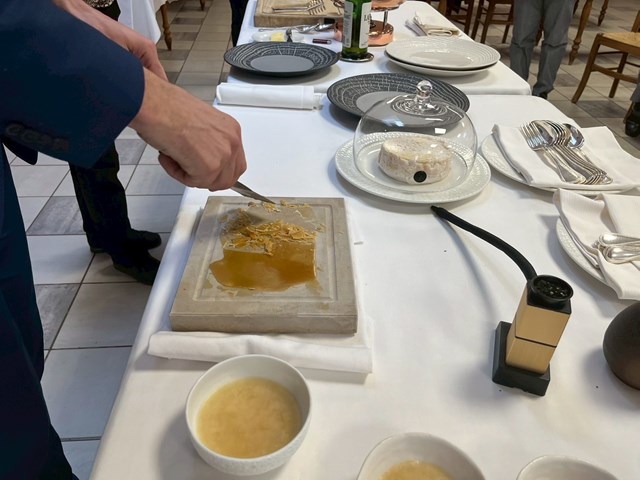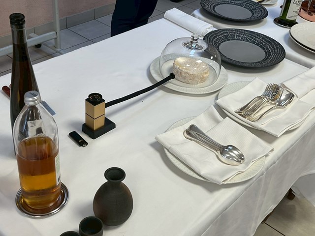 今回使用したフロマージュはスーマントランというブルゴーニュ地方の牛乳で作られたものを使用しました。フロマージュの演出は瞬間的に燻製させるというものでした。今回燻製はリンゴの木のチップスを使用しました。フロマージュは乳脂肪分が多いので燻製にあてる時間が短くてもしっかりと香りがつき、逆に長すぎると苦みが出るので注意が必要です。