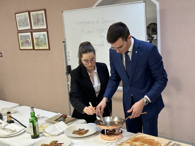 調理の研究生も製菓の研究生もサービスの授業は受けていますが、今回のように、レストランで行っている立ち振る舞いやデクパージュを見て学ぶ機会はあまりないので、興味津々でした。これからムニュ・スペシャルやスタージュに行くにあたってお客様のことを考えた振る舞いやサービスを学ぶいい機会となりました。