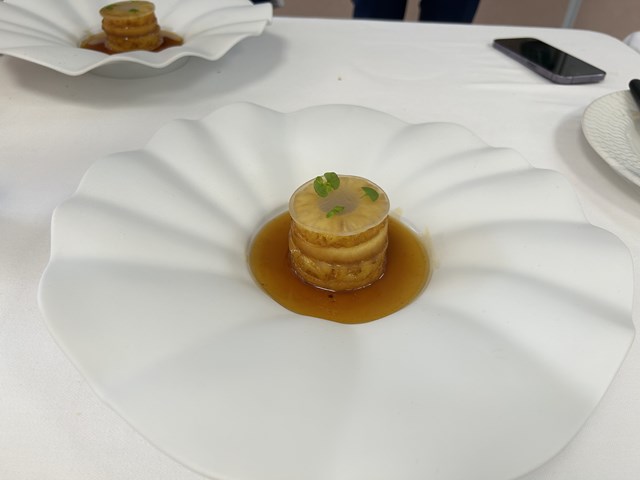 盛りつけは、もちろんデザートもサーバー(スプーンとフォーク)を使って盛りつけます。りんごとパイナップルを積み上げ、間にはスダチのゼリーをシート状にしたものを挟み、ソースを周りにかけて完成です。