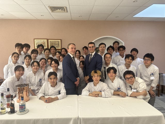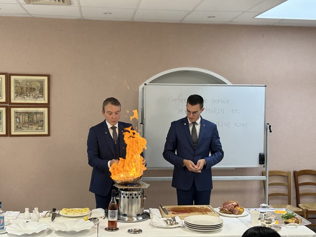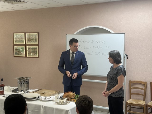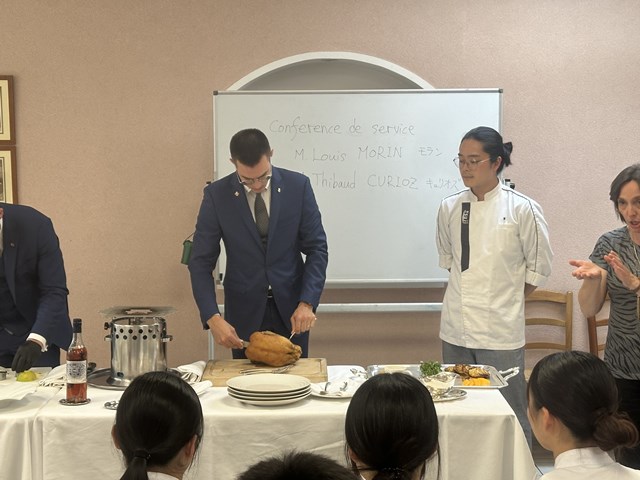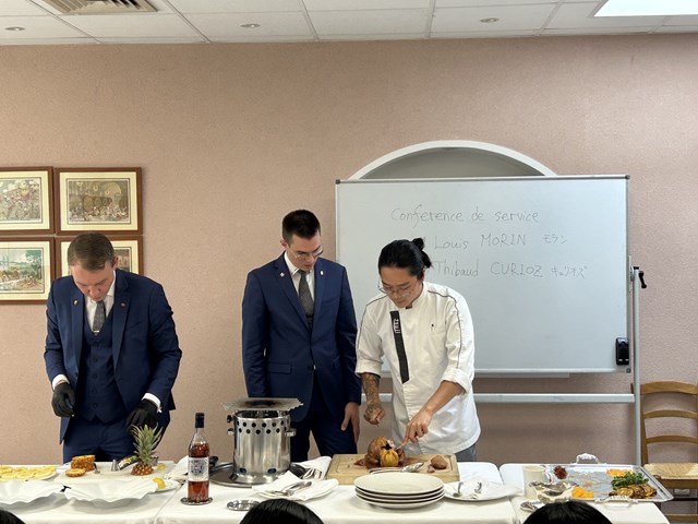 モラン氏は、フランスのミシュランガイド1ツ星レストランMaison DECORET、スイスのミシュランガイド2ツ星レストランMaison Wengerで修行をされた後、2023年にサービス部門のM.O.F.(フランス国家最優秀職人章)を受章、ボルドーのLa Grand'Vigneでディレクターに就任し、現在はPaul Bocuseで働かれています。今回はサービスについての講習になり、調理と製菓の研究生が合同で行いました。