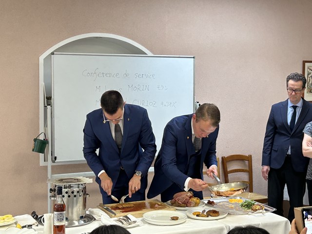 今回の外来講師は伝説のレストラン、Restaurant Paul BocuseのMaître d'hôtelメートル・ドテル (給仕長) である、M.Louis MORIN(ルイ・モラン)氏と、シェフ・ソムリエのM.Thibaud CURIOZ (ティボー・キュリオズ) 氏においでいただきました。