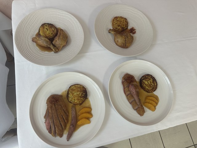 お客様が注文した料理なので、直接食材に触れる事ができないので、鴨の関節にフォークを刺しながらもも肉、胸肉と切り分けていきます。