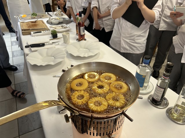続いては、キュリオズ氏によるデザートのフランベです。こちらは、りんごとパイナップルを使った、キュリオズ氏のオリジナルレシピです。フライパンで砂糖、バター、レモン汁を使ってキャラメルを作ります。りんごジュースを加えてソースを作り、りんごとパイナップルを加えて、ソースを染み込ませながら加熱します。