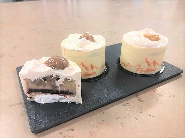 とても薄いチョコレートで作ったケースの中に、底にサクサクの乾燥したメレンゲ、栗のペーストが入ったフワフワのスポンジ生地をしき込み、濃厚な栗のジュレ、マスカルポーネと栗が入ったクリーム、自家製の栗のシロップ煮がゴロゴロっと入っています。表面の仕上げはクリームで凹凸を作り、山のイメージになるように仕上げています。アクセントにフランボワーズ(木苺)のジャムが少し絞り込まれており、栗をふんだんに使用した口当たりがとてもなめらかなお菓子になっています。