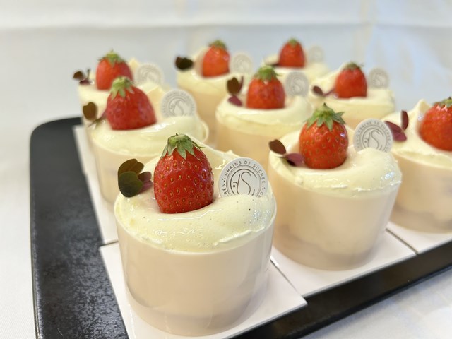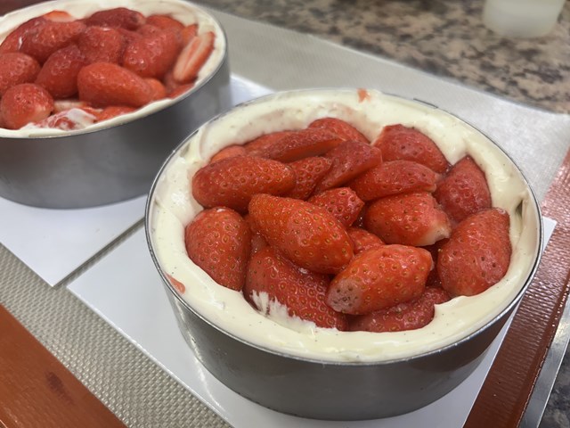 フレジエとは苺の木という意味で、スポンジ生地に苺とクレームを挟んだお菓子のことです。今回は、チョコレートでできた器の中に、ふわふわのスポンジ生地、苺のコンポート、カスタードクリームとゼラチン入りのマスカルポーネクリームを合わせたクリーム、そして、名前の通りたっぷりの苺をぎっしり詰めたケーキです。
