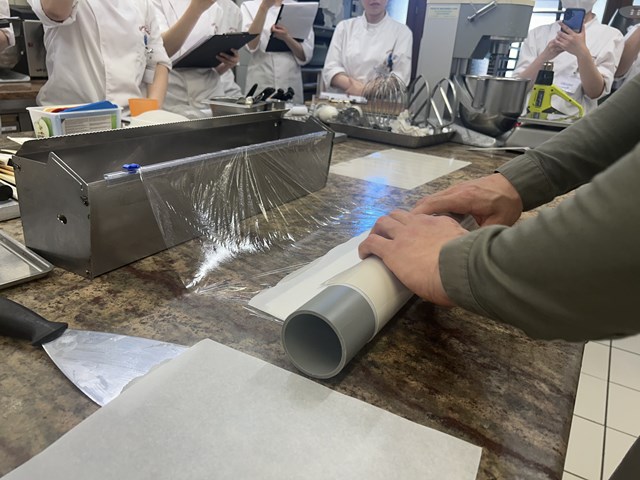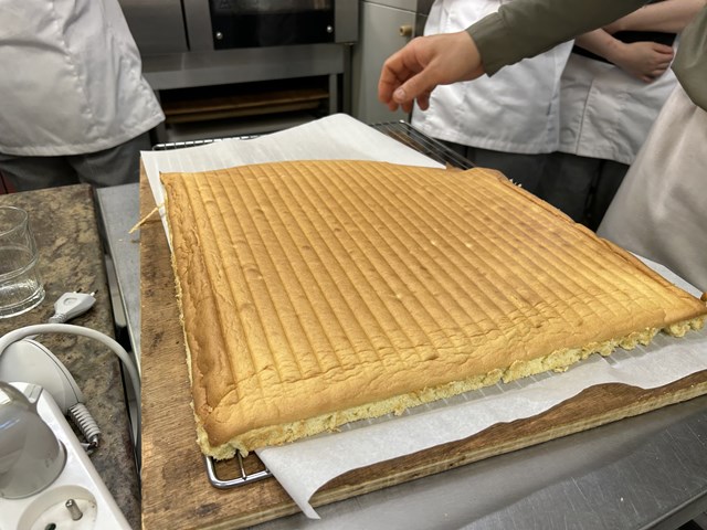 生地は、アーモンドのペーストと卵に空気をたっぷり入れるように泡立て、メレンゲと混ぜ合わせました。ふわっと軽い食感ですがアーモンドのペーストが入っているのでもっちりした食感とアーモンドの味わいも楽しめる生地です。食材を無駄にしないために、全てのグラムが決まっていたり特製の器具を作ることで効率良く作業ができるようになっており、勉強になることがたくさんありました。