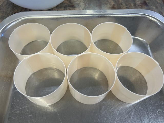 次に、ホワイトチョコで器を作っていきます。調温したチョコを薄く伸ばし、シェフが持ってこられた特製の器具でカットしていきます。
