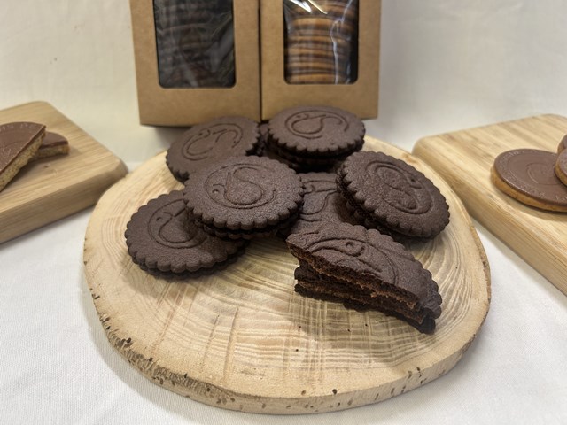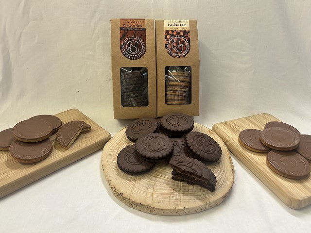 ほろほろサクサクしたショコラのサブレの間に自家製ジャンドゥジャと焙煎して挽いたカカオ豆を細かくすりつぶしたものを混ぜ合わせたクリームを挟んだお菓子です。