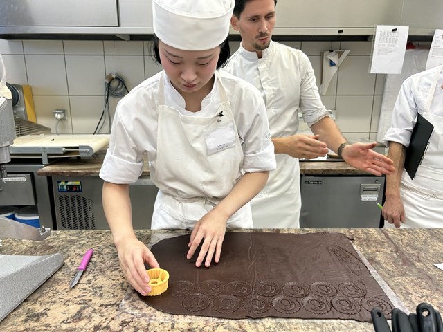 『今回初めて外来講習でアシスタントを経験し、とても緊張しましたが、自分にとってとても良い経験になりました。シェフの丁寧で素早い動きを近くで学ぶことができ、全体を見て次の段取りを考え、片付けながら作業することが綺麗なお菓子を仕上げるためには大切なことだと思いました。今後の実習では段取りを考え、丁寧で素早い作業をできるように心がけていきたいです。次回アシスタントをする機会があれば積極的にフランス語でコミュニケーションを取り、作業により参加できるように努力していきたいです。』