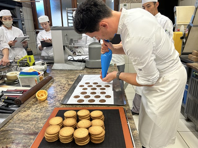 アシスタントの2人も初めての外来講習の中、シェフの動き、絞る量、力加減を良く観察しながら仕上げていきます。