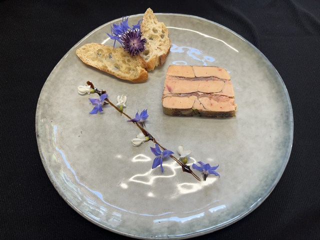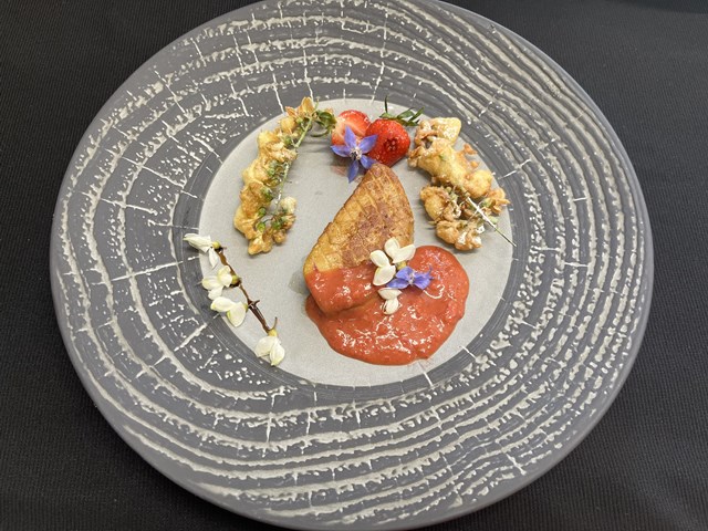 L'escalope de foie gras de canard poêlée aux fraises gariguette et son beignet de fleurs d'acacias