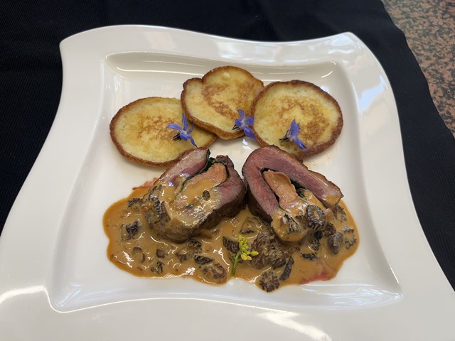 Magret de canard farci aux foie gras sauce morilles, crêpes vonnassiennes