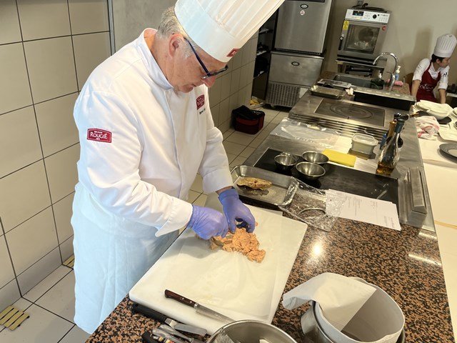 ルージエ社はワインで有名なボルドーやトリュフで有名なペリゴールに近いDordogne(ドルドーニュ)県にあるフォワ・グラを専門に扱う会社で、「Ecole du Foie Gras(エコール・デュ・フォワ・グラ)」というフォワ・グラについて学ぶ研修・研究施設を開校しています。辻調の東京校、大阪校はもちろん、日本のレストランでも幅広く使用されています。
