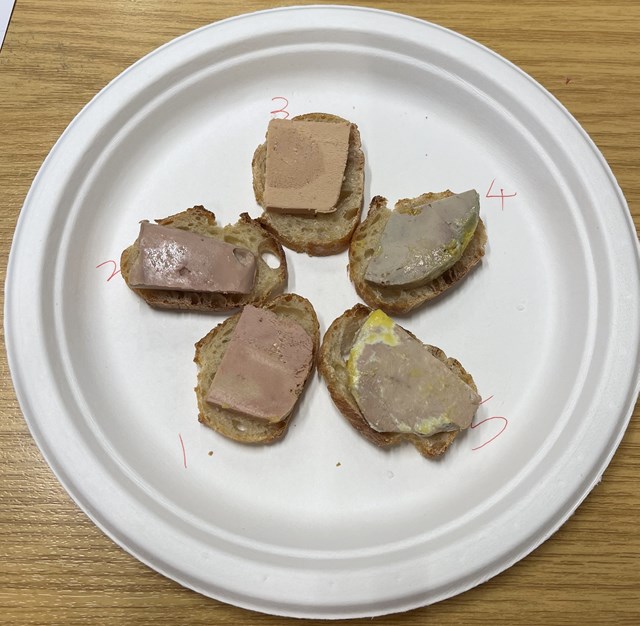 その後は、フォワ・グラの食べ比べです。今回は、ルージエ社の5種類の製品を準備していただきました。