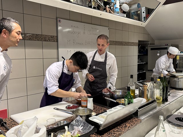 今期第一回目の調理外来講習はロマン・バルト氏にお越しいただきました。バルト氏はシャトー・ド・レクレールから車で30分程の場所にあるボジョレ北部、Vaux-en-Beaujolais(ヴォー・アン・ボジョレ)にある、モルゴンの丘のふもとで、オーベルジュレストラン「オーベルジュ・ド・クロシュメルル」のオーナーシェフをされています。