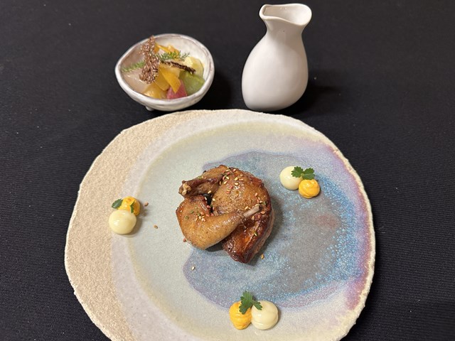 鳩はバターで香りを付けながら焼き上げます。仕上げに白醤油と蜂蜜をとろみがつくまで煮詰めたものを皮目に塗って艶をつけます。