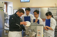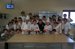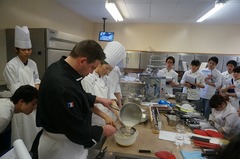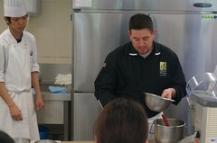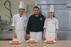 エスコフィエ校製菓コース8回目の外来講習は、リヨンに3店舗を構える「パティスリー・デリス・デ・サンス」よりオーナーシェフのロマリック・ボワイエ氏にお越し頂きました。本店はリヨンでも活気のある、地下鉄のブロトー駅からすぐのところにある人気のパティスリーです。現在研修中の2015年秋コース、神田君も一緒に来校してくれました。