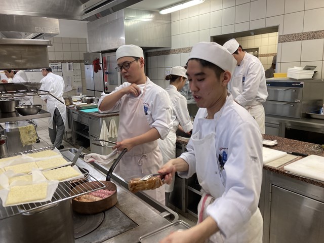 調理研究生の実習は3班に分かれて行いますが、自分はその班の一つのシェフに選ばれました。選ばれた時には驚きましたが、実習が始まると仕込み材料のリストを作ったり、班員に声掛けをしたりと、より忙しい仕事になりますが周りを見ることができるようになったり、班員の作業を確認したりするので成長できることが普通よりあるのでは、と思います。もちろん未熟で班員に支えられてばかりですが、班員のみんなで最後に「よかった」と言い合える班を作ろうと頑張っています。