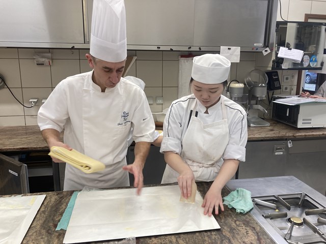 講習では先生との距離が非常に近く、技術だけでなく、生地やクリームの状態の変化、香りなど、さまざまな視点から学ぶことができます。