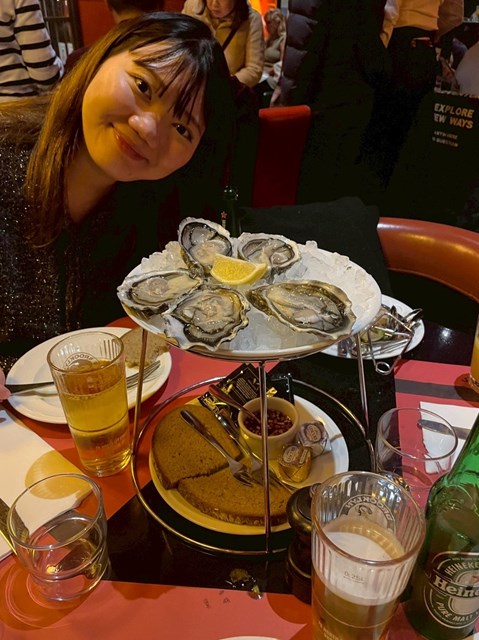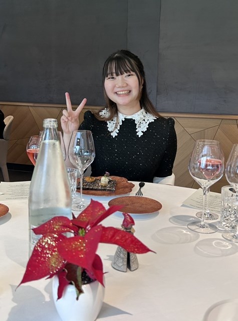 リヨンにあるブラッスリー・ジョルジュを訪れ、オニオンスープや牛肉のタルタルなど、フランスらしい料理をたくさん味わいました。終盤には友人の誕生日サプライズとしてプレートをお願いしたところ、店内が暗くなり、花火の乗ったプレートが運ばれてきて、周りのお客さんも一緒にお祝いしてくれるとても楽しい時間になりました。また、学校の食べ歩き企画でシャトー・モンジョリーにも伺い、初めてミシュランガイド星付きレストランで食事をしました。コースの流れやアシエット・デセールなど、新しいお菓子の表現を学ぶことができ、とても勉強になりました。