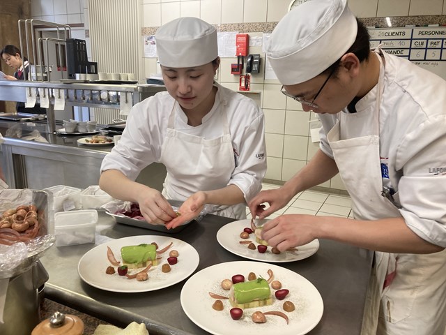 日本では八人で二つの料理を仕上げることが当たり前の環境でしたが、フランス校では二人で二つの料理を完成させます。最初は仕事量の多さやスピード感についていけず、焦ってしまうことも多くペアの相手に頼りきりになってしまっていました。しかし今では実習前に作業工程を組み立てたり、当日の流れを細かくシミュレーションしたりと、事前準備を入念に行うようにしています。そのおかげで少しずつではありますが、現場で働くことを意識しながら実習に取り組めるようになってきました。日本で基礎を徹底して学べたことで、シミュレーション実習での応用がより多くの学びに繋がっていると思います。