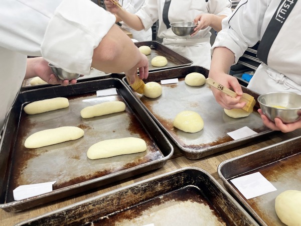 最終発酵させてふくらませた生地は、つや出しに卵をぬってオーブンに入れます。