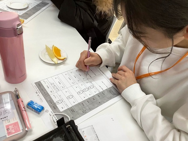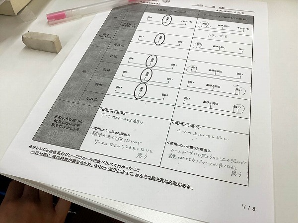 この授業の特徴は、食材を実際に食べ比べて、自身で感じた、色・味・香りなどの特徴を書き記すところにあるんです。