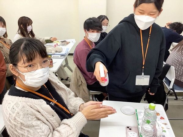 学生がクラスのみんなにアルコールスプレーで消毒に回ります。