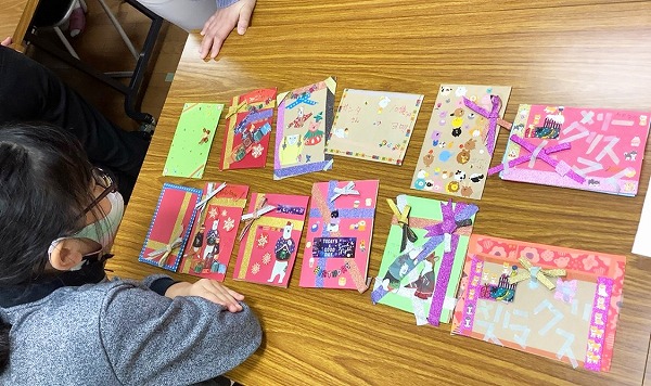 ちなみにカードのベースは不要になった紙袋を、職員に持ってきてもらい、それを学生たちがカード型に切ったものです。
