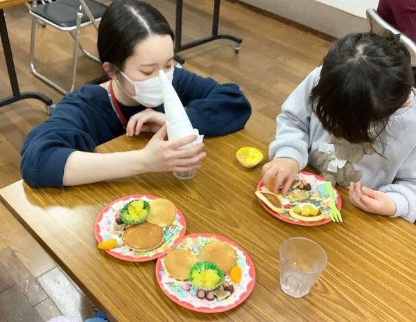 焼きあがったパンケーキをこどもたちに配った後は、自分たちでトッピングをしてもらいます。