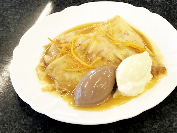 クレープの食感とオレンジソースの甘さ、酸味などが混ざり合いバニラやチョコレートのアイスクリームとよく合います。
