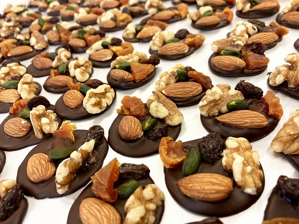 チョコレートを薄く円盤状に絞り出した上にナッツやドライフルーツなどを飾っています。