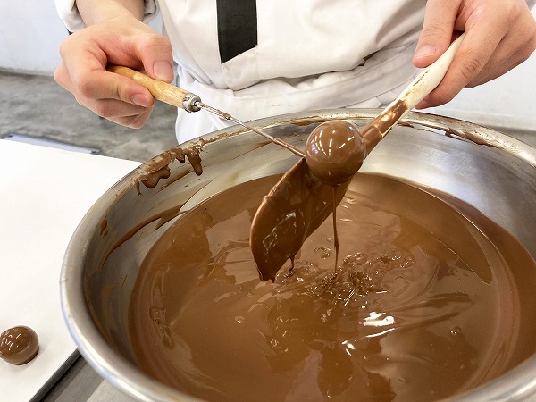 表面を薄くチョコレートでコーティングする作業の事で、チョコレートの濃度や作業スピードなどがとても大事な工程です。