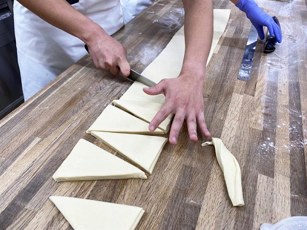 ベーコンを包んだ棒状の生地をハサミでカットすると、皆さんおなじみのベーコンエピになります。