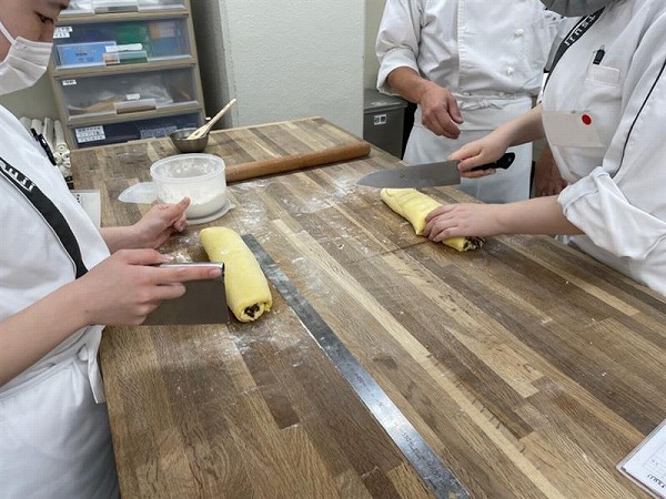 スイートロールは、生地を四角に伸ばしてクリームやフィリングをロール状に巻いてカットします。