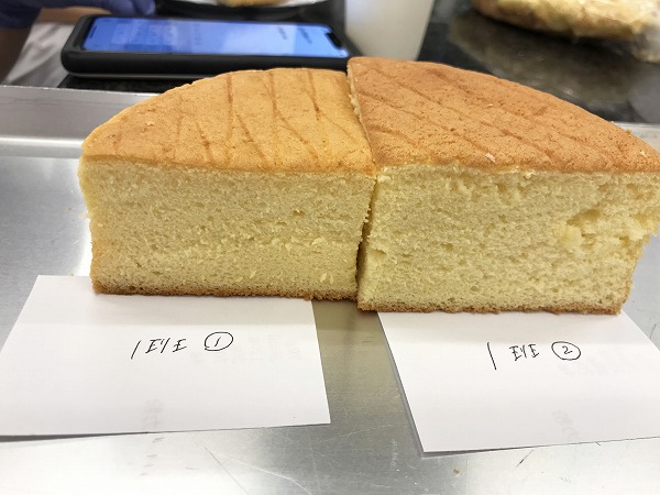 その後、試作①回目として「オリジナルのスポンジ生地の研究」。