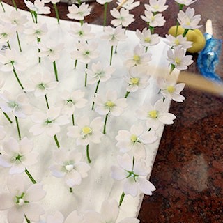 (1つの桜に5枚花びらがついているので、計算すると...必要な花びらは約400枚!小さな花びらをコツコツと作成していました...)