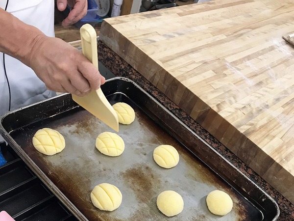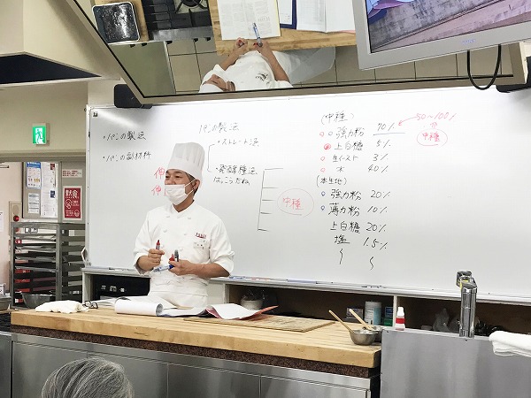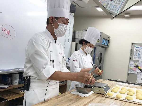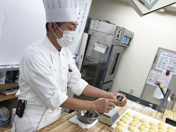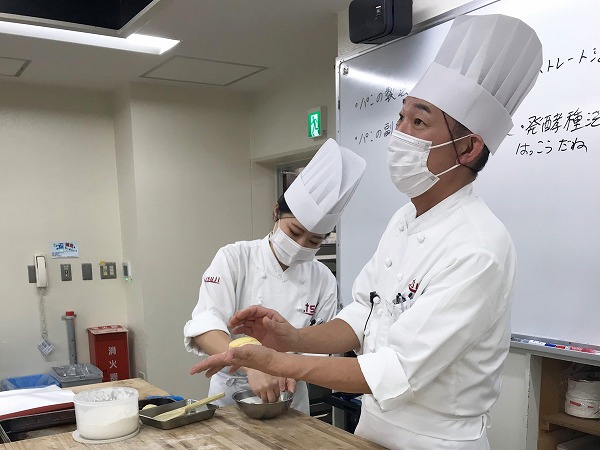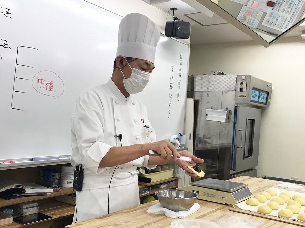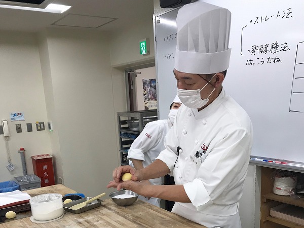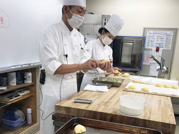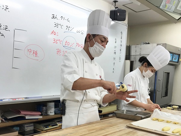 さて、その菓子パンですが、学生たちは実習であんパンとメロンパンを作製するために、先生のお手本を見ます。