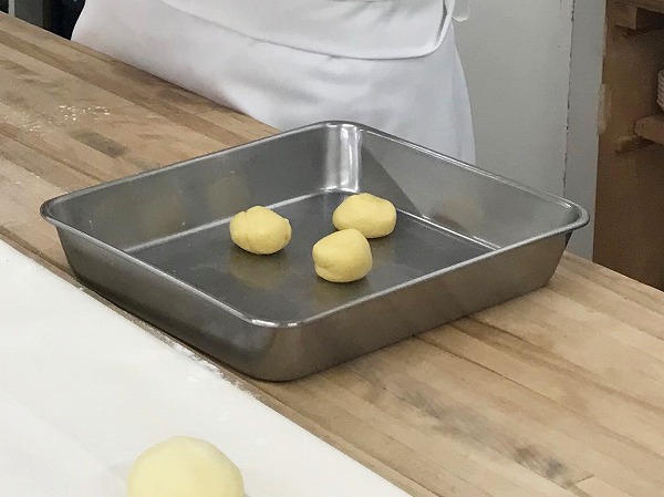 手の平の上で生地を丸め、パン生地を包んでいきます。